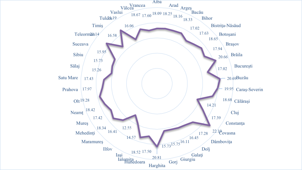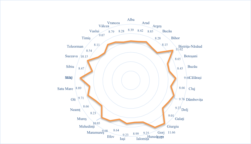 Notă: Pentru o mai bună reprezentativitate a graficului, județele care înregistreză procente sub 7% au fost eliminate: Brașov, Brăila, București, Caraș-Severin, Constanța, Covasna, Harghita, Prahova, Tulcea.