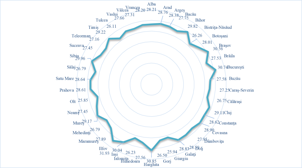 În ceea ce privește aspectele legate de structura afacerilor pe grupe de vârstă la nivelul județelor, raportat la categoria până la 29 de ani, în anul 2020, situația concretă ilustrată prin intermediul structurii radiale se prezintă astfel: