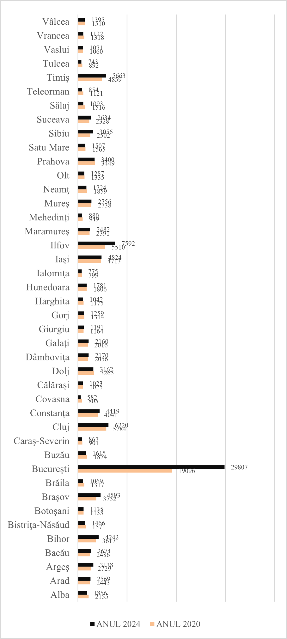 Graficul alăturat reflectă imaginea înmatriculării de companii la nivel regional în anul 2023 și anul 2024. O primă observație cu privire la imaginea fenomenului este redată de scăderea companiilor înmatriculate în anul 2024 față de anul 2023 cu aproximativ 15 procente. Cele mai multe companii înmatriculate în anul 2023 precum și în anul 2024 sunt identificate la nivelul Bucureștiului, urmat de județul Ilfov, Cluj, Timiș și Bihor. Județele în care se înregistrează cele mai mari scăderi absolute în intervalul 2023-2024 au fost: Bihor, București, Cluj, Dolj și Dâmbovița.