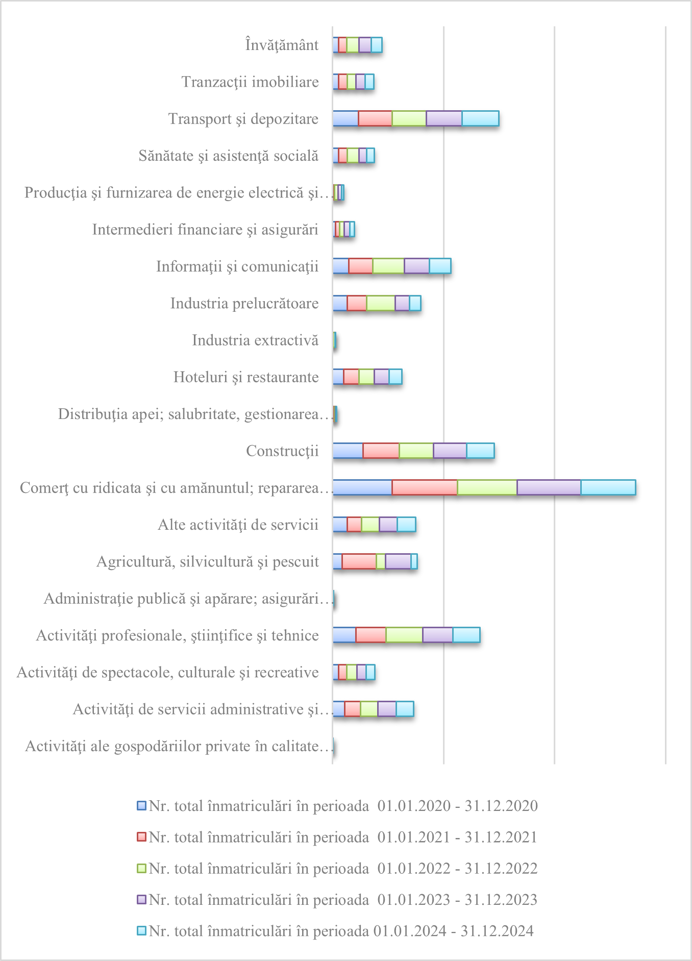 Un alt aspect important de conturat este legat de modul în care fenomenul înmatriculării este reflectat la nivelul obiectului principal de activitate al companiilor. O imagine de ansamblu a asepctului poate fi vizualizată alăturat. La prima vedere, domeniul care înregistrează cele mai multe înmatriculări este Comerţul cu ridicata şi cu amănuntul; repararea autovehiculelor şi motocicletelor. Următorul domeniu în care se remarcă valori crescute ale fenomenului spre deosebire de celelalte domenii este redat de Transport și depozitare. De asemenea, valori ridicate sunt constatate și la nivelul domeniului Construcțiilor.