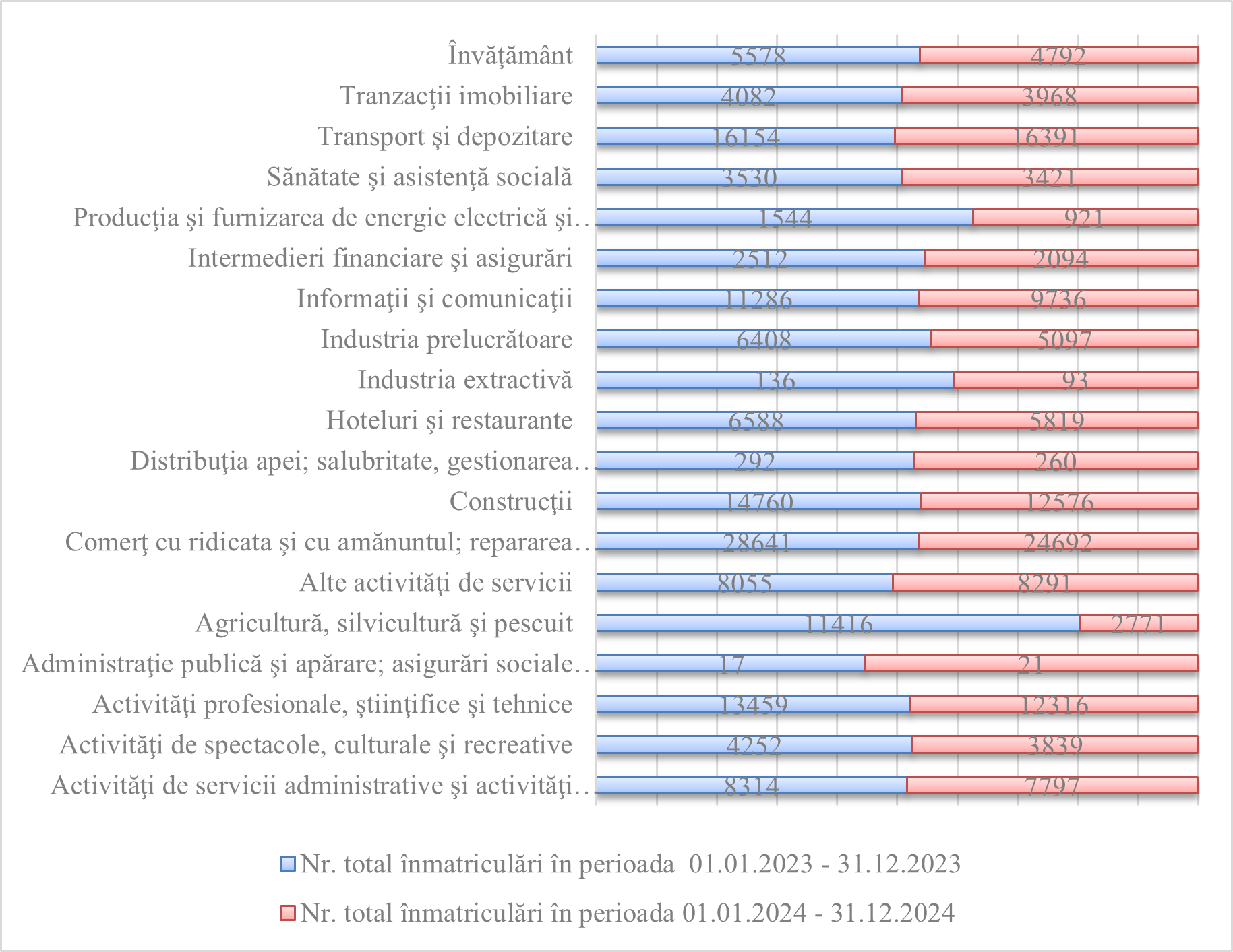 În ceea ce privește imaginea fenomenului la nivelul celor doi ani, și anume 2023 și 2024, sunt câteva aspecte necesare de punctat legat de dinamica identificată la nivelul domeniilor de activitate principale ale companiilor. Precum am menționat și pe parcursul acestui material, per ansamblu imaginea înmatriculării la nivelul celor doi ani de referință este negativă, numărul de companii înmatriculate cunoscând o scădere cu 15%. Domeniul care surprinde cea mai scăzută rată a înmatriculării de companii la nivelul anilor supuși analizei este Producţia şi furnizarea de energie electrică şi termică, gaze, apă caldă şi aer condiţionat cu o rată de scădere de 40% în anul 2024 față de anul 2023, urmat de Industria extractivă și Industria prelucrătoare. Rate pozitive privitor la acest fenomen al înmatriculărilor în perioada 2023-2024 se identifică în cazul domeniilor: Administraţie publică şi apărare; asigurări sociale din sistemul public, Alte activități de servicii și Transport și depozitare.