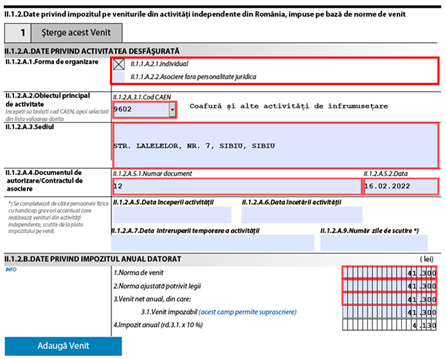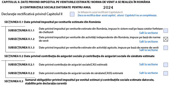 #3 completează secțiunea privind impozitul pe venit datorat pentru anul 2024 prin completarea subsecțiunii II.1.2 Date privind impozitul pe veniturile din activități independente din România, impuse pe bază de norme de venit