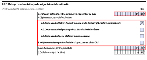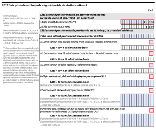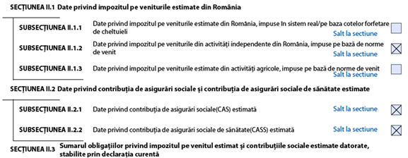 Completarea secțiunii II.2 Date privind contribuția de asigurări sociale și contribuția de asigurări sociale de sănătate estimate. Ne întoarcem așadar la cea de-a doua pagină a declarației și punem bifa în dreptul Subsecțiunii II.2.1 Date privind contribuția de asigurări sociale (CAS) estimată și Subsecțiunii II.2.2 Date privind contribuția de asigurări sociale de sănătate (CASS) estimată.