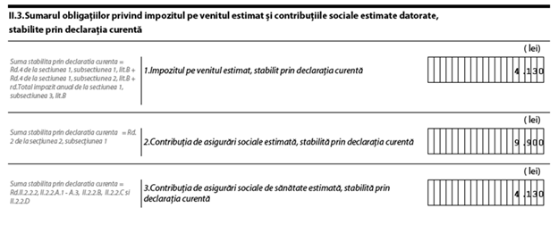 #6 sumar al taxelor datorate de către entitate, după completarea tuturor aspectelor legate de impozitul pe venit, contribuția de asigurări sociale și contribuția de asigurări sociale de sănătate, vizualizat în cadrul subsecțiunii II.3. Sumarul obligațiilor privind impozitul pe venit estimat și contribuțiile sociale datorate, stabilite prin declarația curentă
