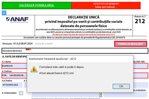 #7 validează formularul D212 prin acționarea butonului Validează formularul, regăsit în prima pagină a declarației.